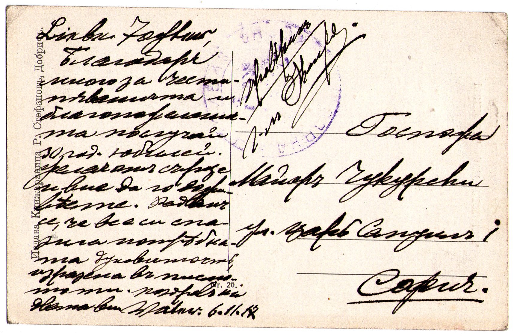 Пощенска картичка с лика на ген. Кантарджиев. Издадена от книжарница Р. Стефанов, Добрич. Изпратена до София, 06.11.1917 г. Гръб.