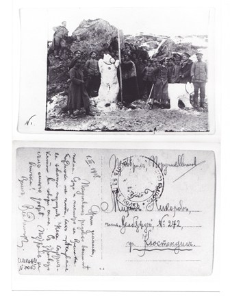 Войнишка картичка (лице и гръб), представяща традицията да се правят снежни мечки, Първа световна война, 1 март 1918 г.