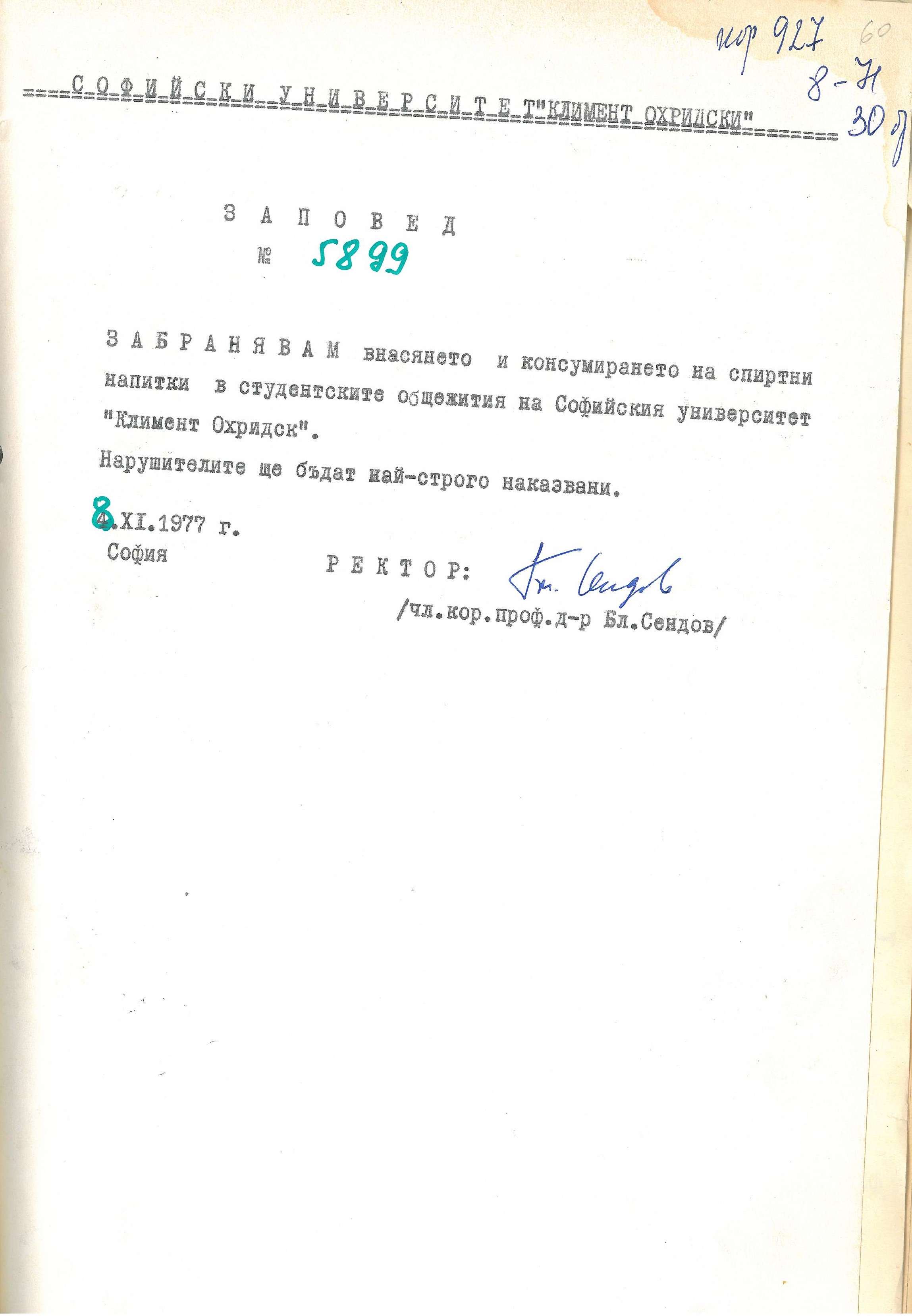 Изпратено от admin on Пет., 13/08/2021 - 07:35Ректорска заповед, забраняваща внасянето на алкохол в студентските общежития на Софийския университет, 1977 г.